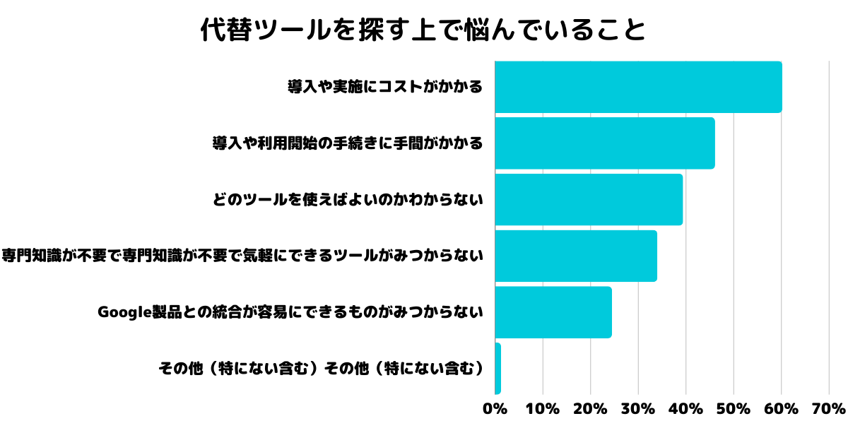 ユーザーが代替ツールの選定に際して直面している主な悩みとしては、「導入や実施にコストがかかること」が60.2%で最も多く、次いで「導入や利用開始の手続きに手間がかかる」(46.1%)、「どのツールを使えばよいのかわからない」(39.4%)と続きます。これらの悩みは、新たなツールの導入を考慮する際の主要な障壁となっており、特に中小企業や予算の限られた組織にとっては、適切なツール選択を一層困難にしています。