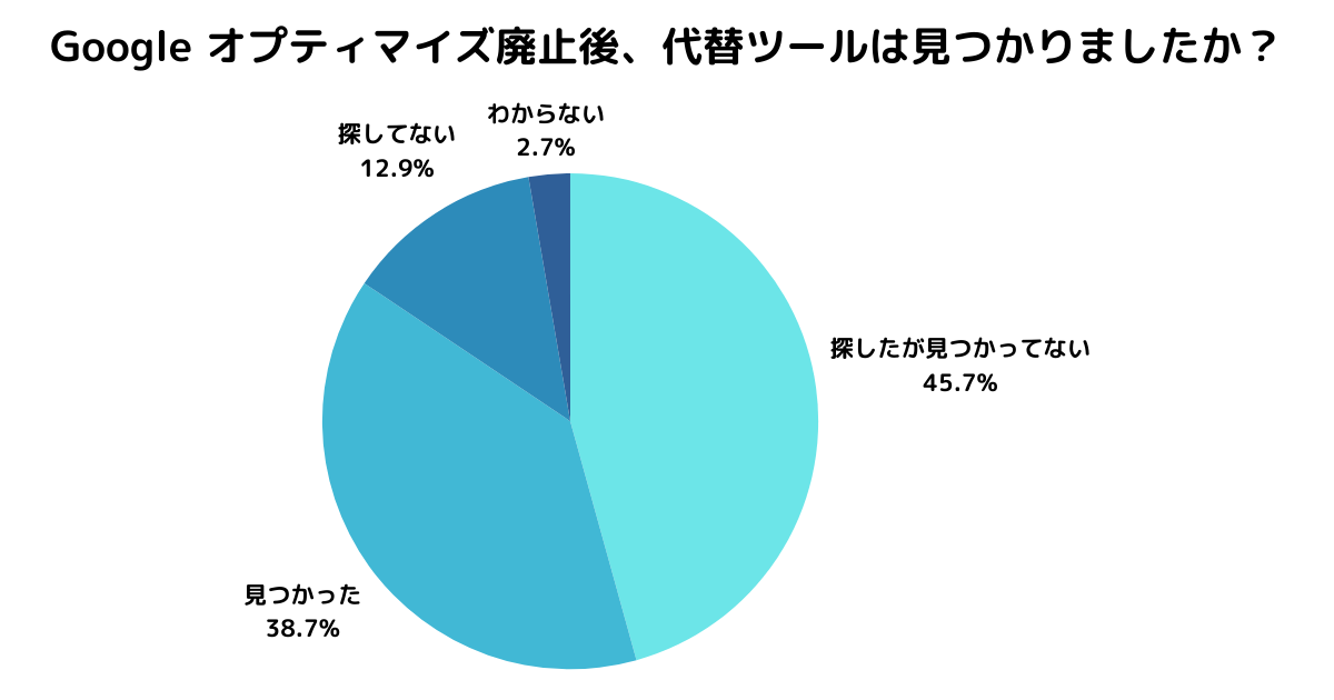 Google オプティマイズのサービス終了発表を受けて行われたキーマケLabによる調査は、この変化が既存ユーザーに与えた影響の深さを浮き彫りにしました。調査によると、日本在住で過去5年以内にGoogle オプティマイズを利用した経験がある527名のうち、約半数(45.7%)が代替ツールを探しているものの、まだ見つかっていないと回答しています。この結果は、市場における代替ツールの選択肢に対する認識の不足や、適切な情報へのアクセスの難しさを示しています。
