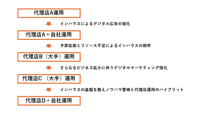 そこからメディアやPRも含めた施策を強化するために代理店Cへ変更し、さらにインハウスの基盤が整ったタイミングで代理店Dへと切り替えていきました。