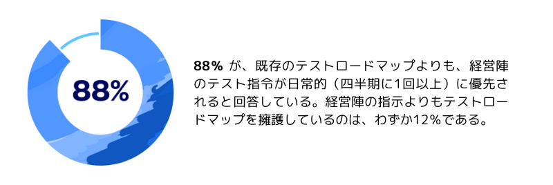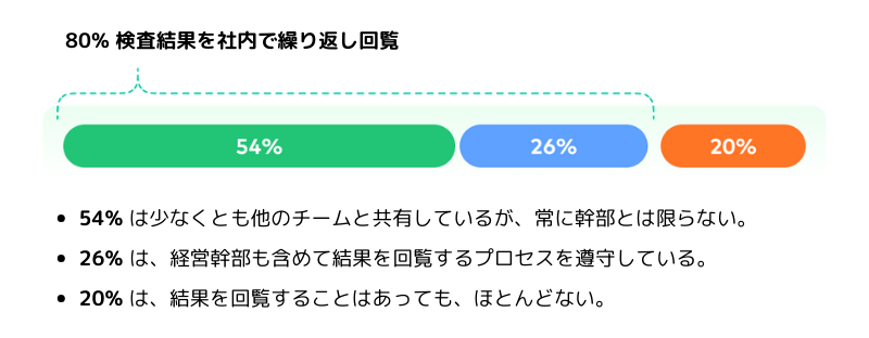 ほとんどの組織がテスト結果を共有していますが、かなりの割合の組織が卓越した基準を満たす方法でそれを行っていない可能性があります。多くの組織はテスト結果を共有するための体系的なアプローチを欠いており、これが部門間や経営陣との効果的なコミュニケーションと協力を妨げる可能性があります。