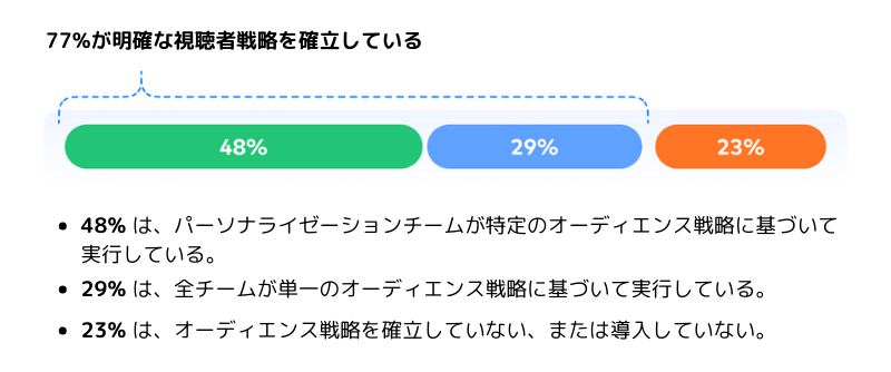 - 多くの企業がオーディエンス戦略の重要性と確立されたKPIを認識していますが、エピソード的な意思決定や短期的な成果への依存が、競争優位性を得るためのオーディエンスニーズの明確な把握の妨げとなっていることがよくあります。