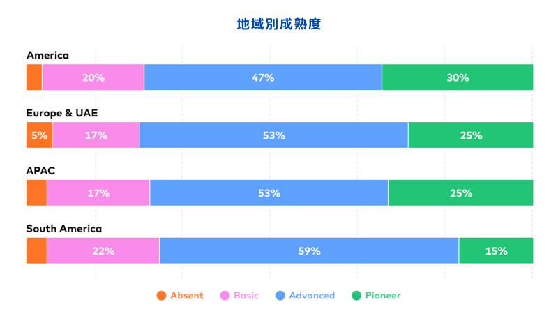 - ヨーロッパとUAEの企業はより一貫した状況を示しており、ほとんどの企業が自社をAdvancedと考え、Absent、Basic、Pioneerレベルが同程度の割合となっています。