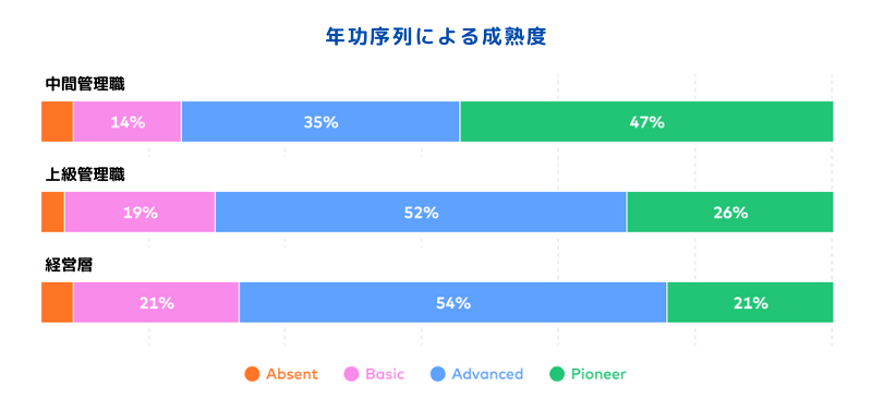 - 上級管理職も、プログラムの有効性についてより批判的である傾向があり、他の職位や世界平均と比較して、自社のプログラムをAbsentやBasicレベルと回答する頻度が高くなっています。