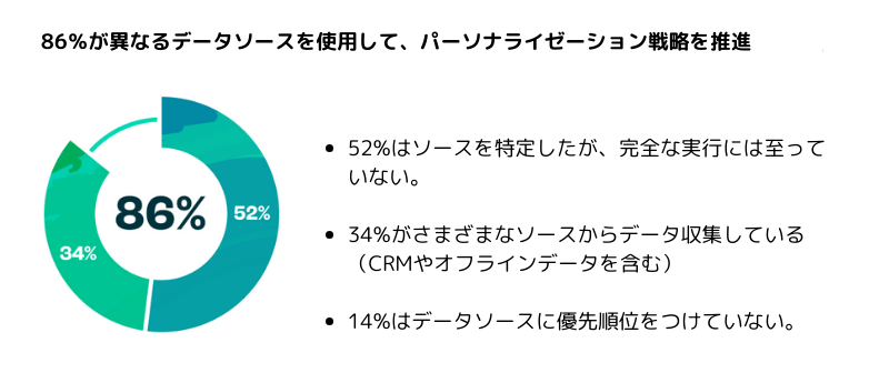 ほとんどの組織がパーソナライゼーション戦略を推進するための意味のあるデータソースを特定していますが、かなりの割合の組織がそれらをパーソナライゼーションの取り組みに完全に統合できていません。これは、ブランドが初期分析において十分に包括的でないことが多く、そのため現在、顧客の嗜好や行動についてのより包括的で全体的な理解を持っていないことを示しています。