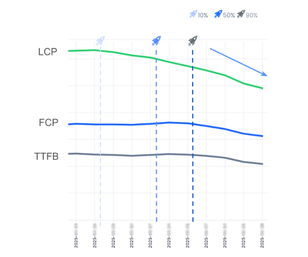 この成果は、第三者の客観的なデータによっても裏付けられています。Googleが実際のChromeユーザーの体験を基に集計するCrUX(Chrome User Experience Report)において、LCPが「良好(Good)」とされるユーザーの割合は、Speed Kit導入前の63%から導入後には76%へと大幅に増加しました。特筆すべきは、2025年6月には、ベルーナ様のサイトが過去2年間で最速のパフォーマンスを記録したという事実です。これは、今回の取り組みが単なる微調整ではなく、サイトの歴史においても画期的な改善であったことを物語っています。