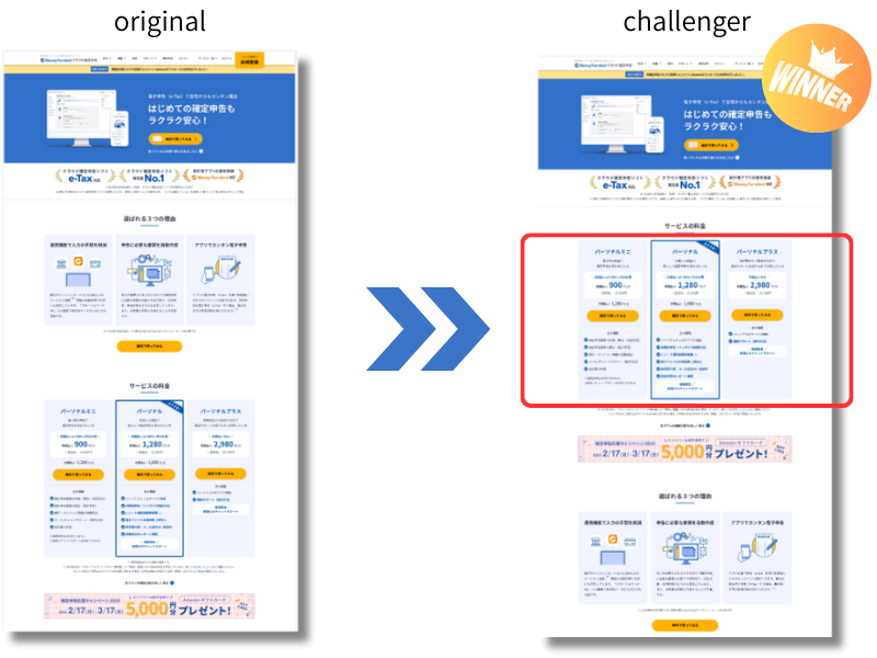 一つは、個人向けの確定申告ページのテストです。通常、Webサイトではサービス概要を先に伝え、価格情報は後に配置するのがセオリーですが、「個人向けサービスなら、まず料金を知りたいのではないか」という大胆な仮説を立てました。そこで、ページの最上部に料金セクションを移動させるという、UXの観点からは少し冒険的とも思えるテストを実施したところ、CVRが大幅に改善するという驚くべき結果が出ました。
