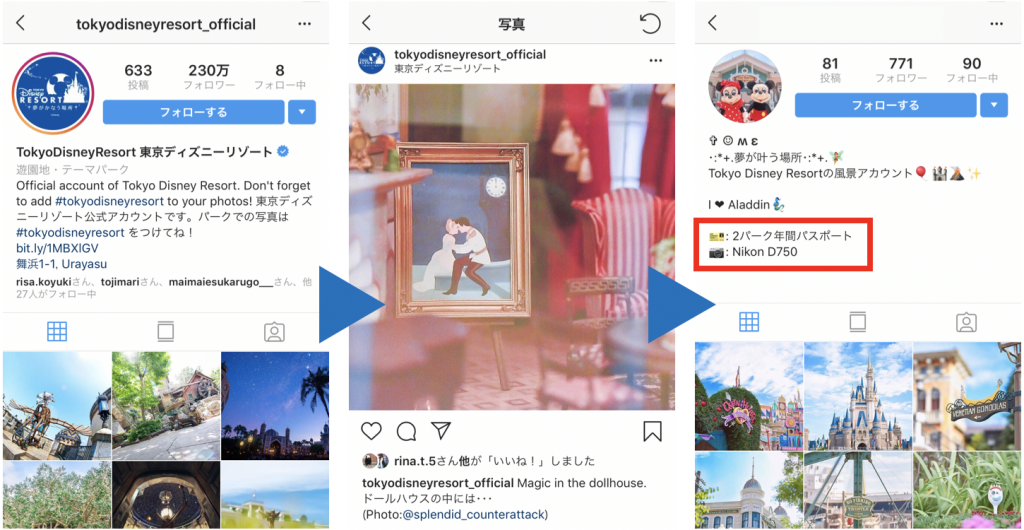 ②①で紹介されたアカウントの過去投稿を見て、気になる写真があれば、ハッシュタグやプロフィール情報から、機器情報を確認。