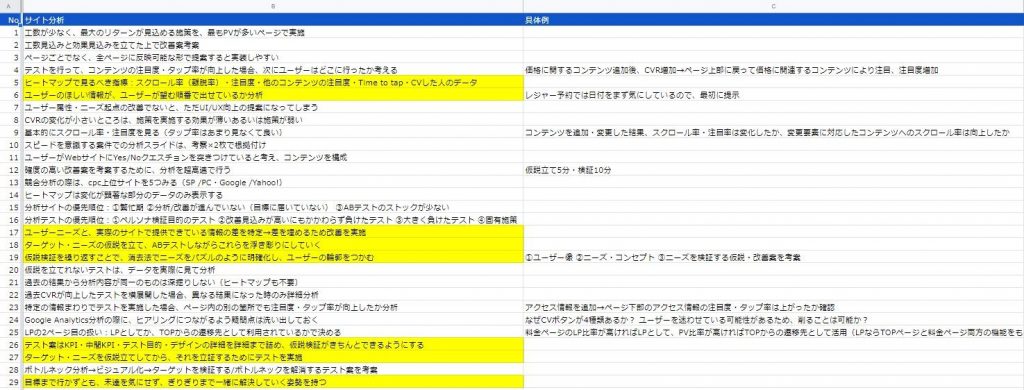 参考画像1:スプレッドシートにまとめた分析の観点