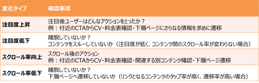 参考画像2:ヒートマップのデータに変化が起きたときに、確認すべきユーザーの行動例
