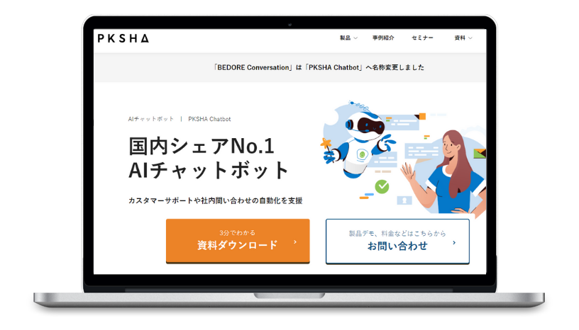 PKSHA Chatbotは、3,700万件超のQ&Aデータが学習済みのサポート業務特化のチャットボットです。