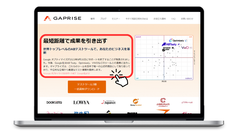 Webサイトの運用で改善したい課題がある、集客効果を最大化したい企業様は、ギャプライズにご相談くださいませ!分析・施策立案からABテスト、最適化、実装までを一気通貫で支援いたします。