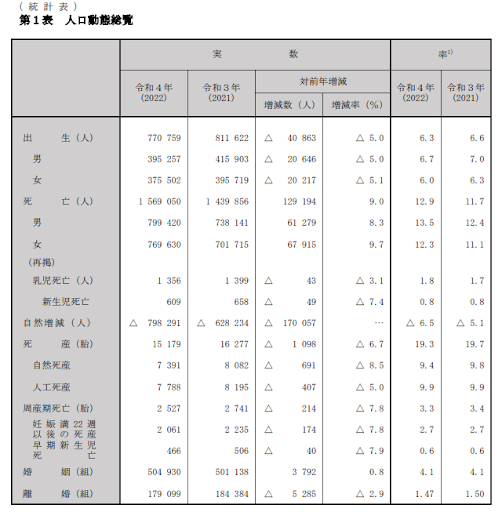 参照:令和4年(2022) 人口動態統計(確定数)の概況|厚生労働省