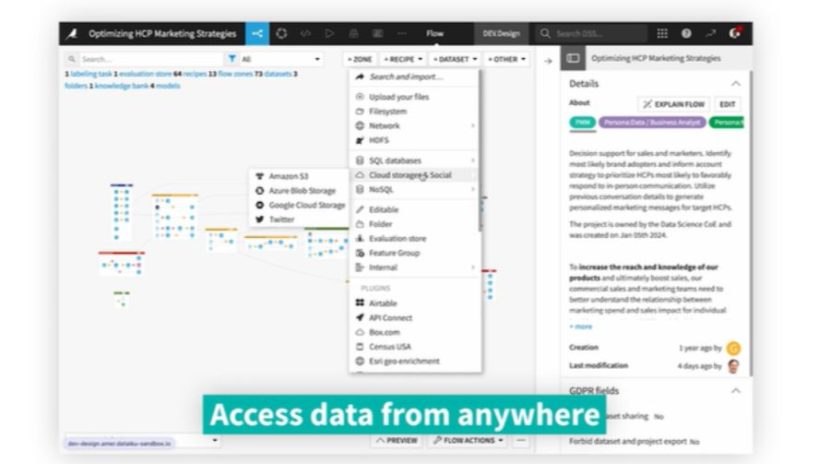 Dataikuでは以下のデータソースに接続でき、データを可視化しながら準備を進められます。