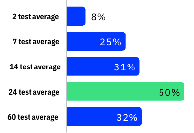 実験の本質は、もはや推測に頼らないことです。しかし、多くのテストは単純な変更にのみ焦点を当てています。例えば、ボタンの色や文言の変更などです。テスト頻度を測定することは、取り組みに勢いをつける素晴らしい方法です。中央値の企業は年間34件の実験を実施していますが、上位3%の企業は500件以上実施しています。上位10%に入るには、年間200件の実験を実施する必要があります。