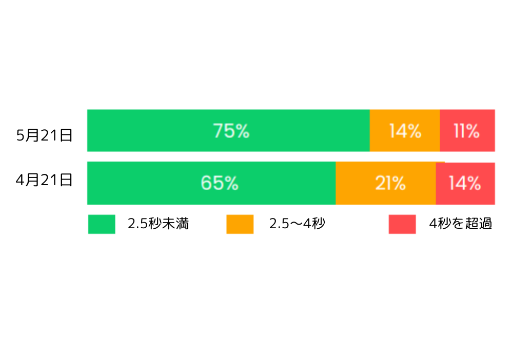 4月21日のLCPと5月21日のLCPをグラフで表しました。Speed Kitが導入されたのは5月で、LCPを1か月で10%改善することに成功しました。これは24%高速化したことを意味しています。
