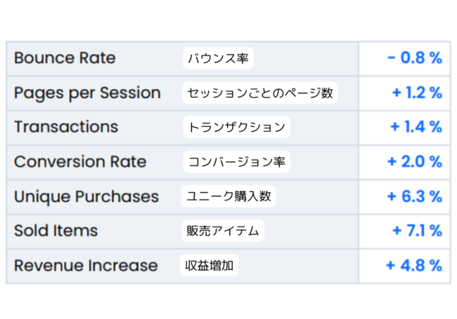 技術的な速度メトリクスの改善、例えばTime To First ByteやLargest Contentful Paintがビジネスの成功にどのような影響を与えるかを定量化するために、Speed Kitチームは長期間にわたるABテストを実施し、改善されたユーザーエクスペリエンスの効果に関する統計的に有意なデータを収集しました。まず、よりページ速度を高速化させることはバウンス率の低下とセッションごとのページビューの増加に繋がりました。これにより、トランザクションが増加し、コンバージョン率が2%向上しました。さらに、改善されたページ速度は平均カート投入額の増加ももたらし、総収益が4.8%増加しました。