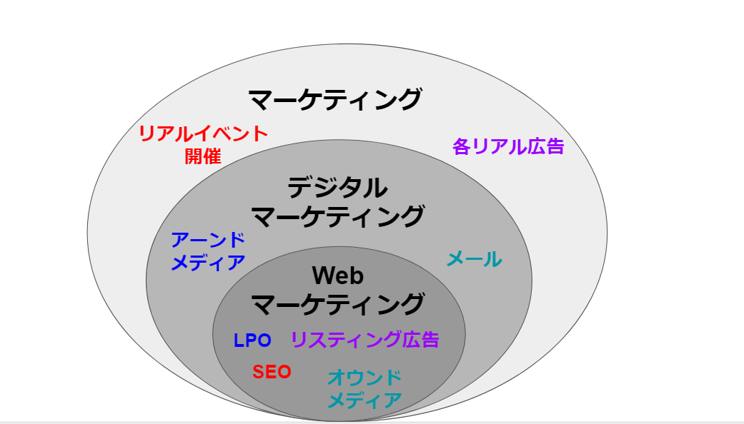 つまり、Webマーケティングはデジタルマーケティングの一部ということで、まさにこんな感じです。
