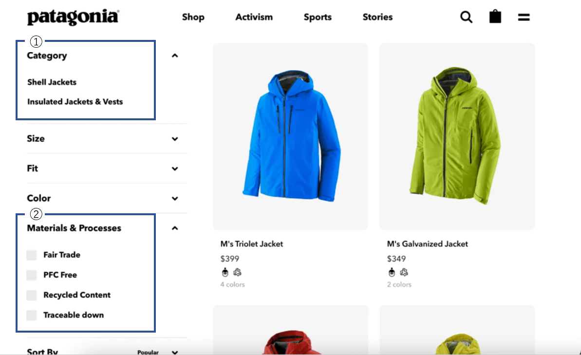 また、ブランドによっては、写真ではわかりにくい商品の重要な属性をカテゴリー別に絞り込むこともできます。例えば、Patagoniaのサイトでは、登山用ジャケットを①「カテゴリー」で2つのタイプに分けて絞り込み、さらに②「素材・技術」でも絞り込みが可能です。
