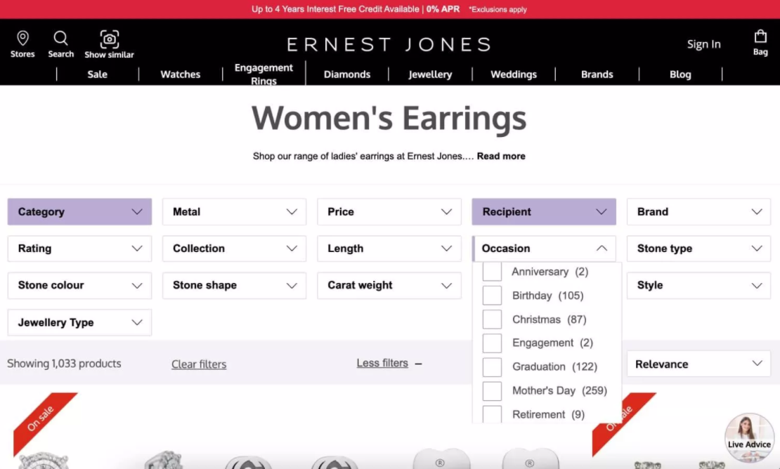 ジュエリーブランドのErnest Jonesは、お客様が人生の節目に買い物をすることが多いことを理解しており、「イベント」で絞り込み、「記念日」「誕生日」「卒業式」などの条件を選ぶことができるようにしています。