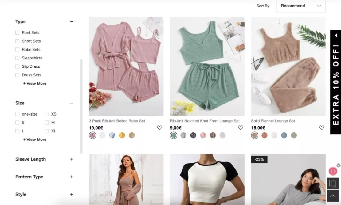一定数の条件のみ表示する場合は、1つのセクションに10個以上の商品タグが掲載されているときです。買い物客が隠れたフィルターに気づくように、SHEINの 「もっと見る(+View More)」のような明確なCTAを入れましょう。
