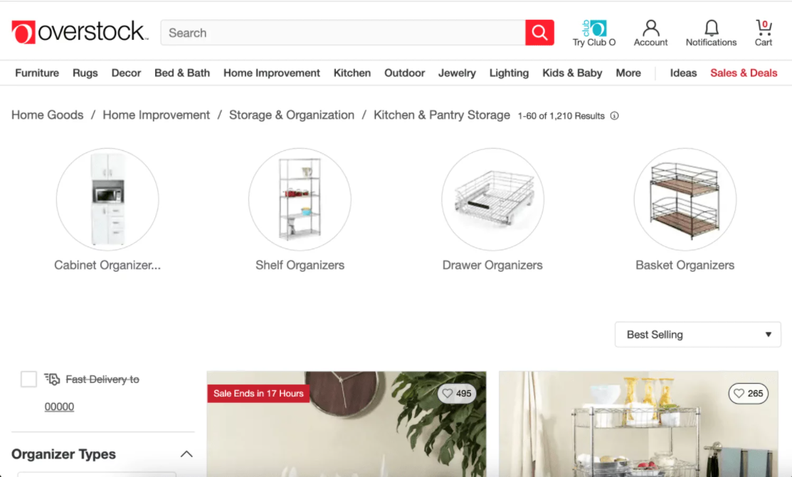家具のオンラインストア・overstockでは、画像をベースにした絞り込み検索をページ上部に配置して、ユーザーが興味のある商品タイプを絞り込むことができます。