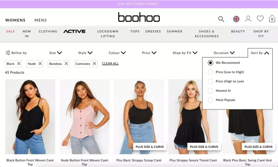 Boohooは、並び替え機能と絞り込み検索機能の両方を表示できる水平方向のツールバーを採用しています。また、買い物客が大きな矢印で隠れた詳細な絞り込み条件に気づくようにしており、そこに他の方法では収まらない複数の絞り込み条件を含めることができます。