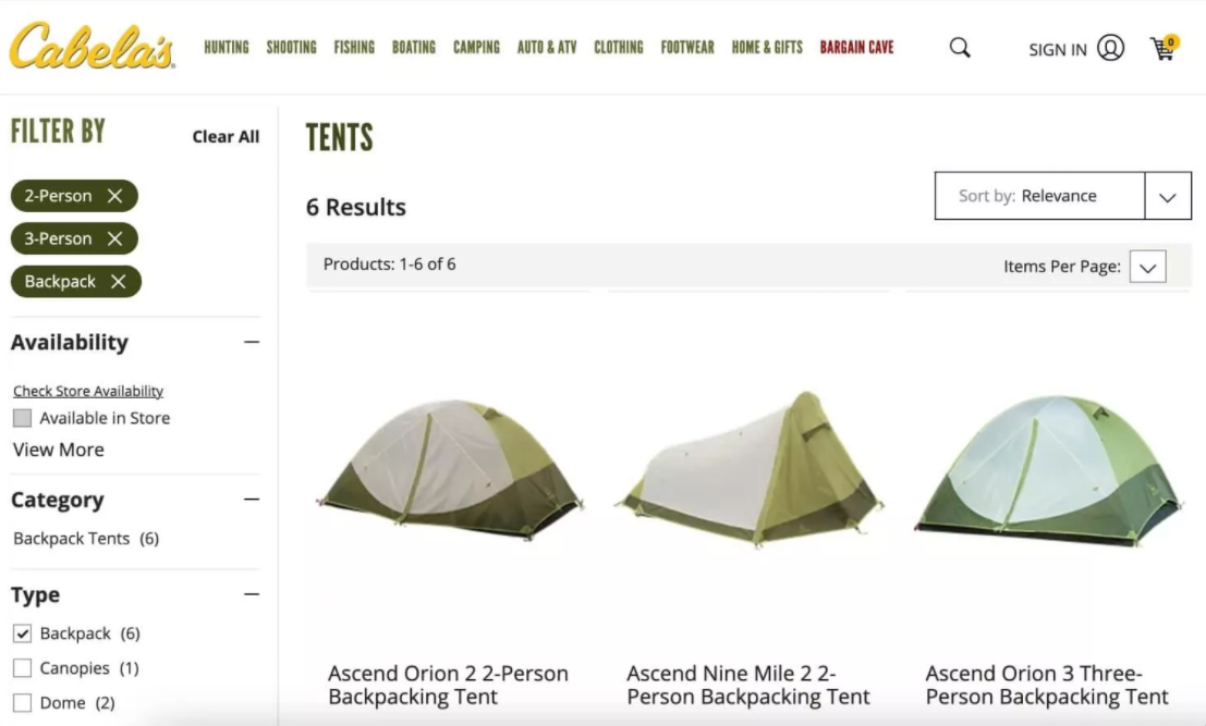 Cabela’sでは、適用された条件を、絞り込み検索の上部に目立つように配置しています。また、必要に応じて適用された条件の選択解除を簡単に行うことが可能です。
