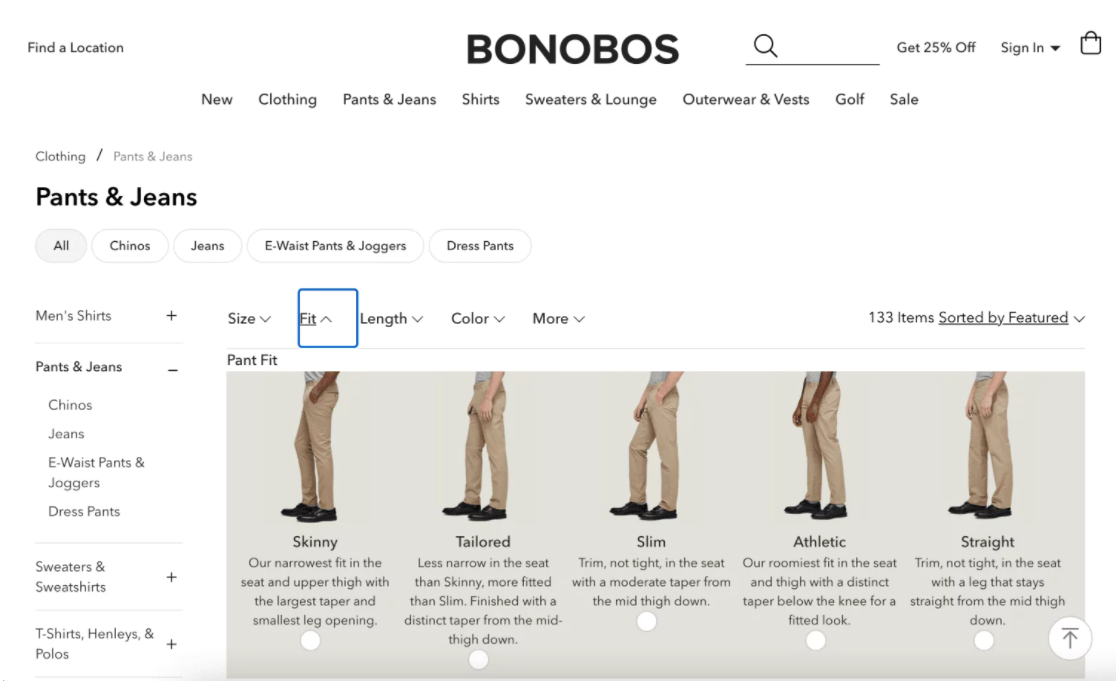 例えば、アパレルブランド・Bonobosでは、「フィット」フィルターに画像を掲載し、商品をイメージしやすくしています。