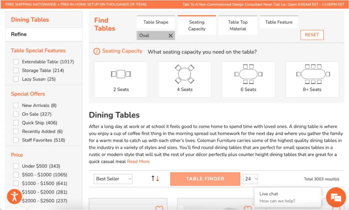 インテリアブランド・Coleman FurnitureのECサイトでは、画像をベースにした簡単なアンケートを実施し、商品をさらに絞り込むことができます。