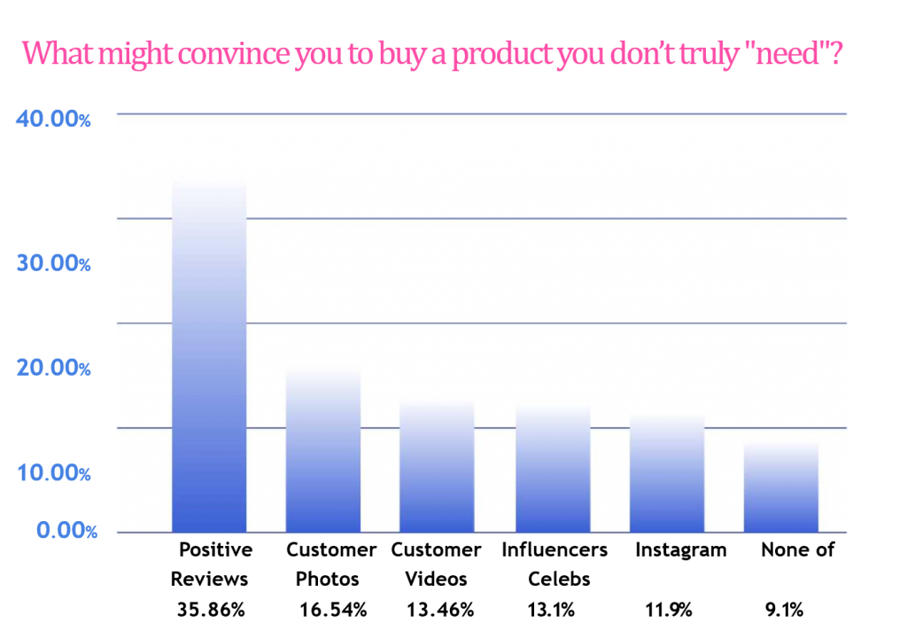 UGCマーケティングツールを提供するYOTPO社が行った、約2000人の女性の美容(※1)消費者1,875人への調査結果「D2C Beauty Trends Report」によると、対象女性の44.7%が「顧客レビューが特定のブランドからの購入に最も影響力がある」と答えています。